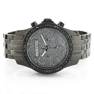 This Luxurman Black Diamond Watch features 2.25 carats of sparkling black diamonds on the bezel of the black tone stainless steel case. This Luxurman diamond watch showcases a black dial fully paved in white stones with Date/Calendar/24 hours hands and a black tone stainless steel band. This diamond watch by Luxurman comes with two interchangeable straps in different colors. This Luxurman Diamond watch is a perfect present for any occasion.